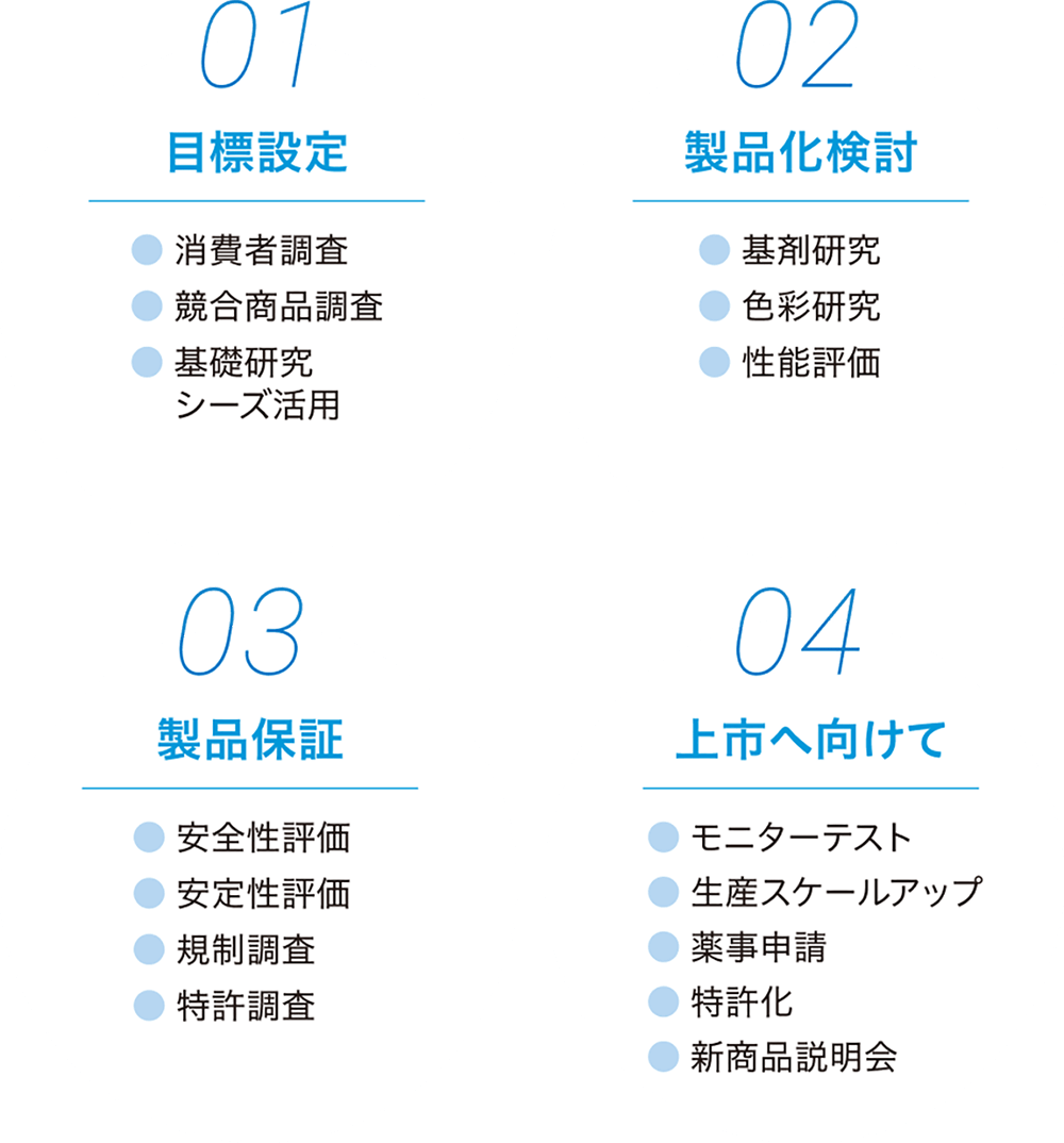 製品の品質保証や医薬部外品の申請に関するデータの収集、自社製品の安定性評価、競合他社商品の調査なども行っています。