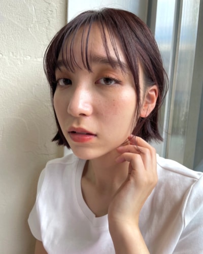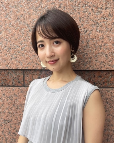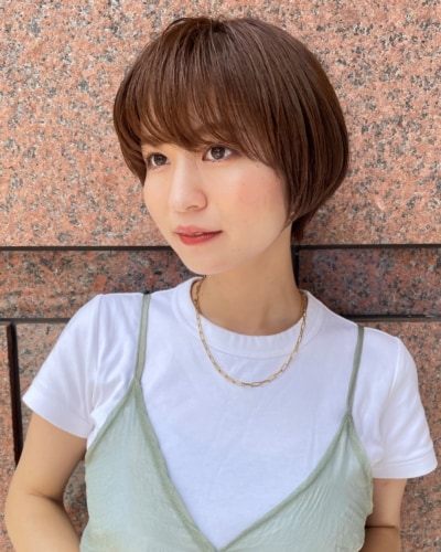 えりあしをタイトにカットし、バングは目上ぎりぎりに流れるようにすることで子どもっぽくなりがちなショートを上品に仕上げています。カラーはアッシュブラウンで透明感を演出。