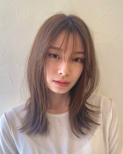 全体をブリーチしシダーベージュをのせることでツヤ感を出しています。顔周りにレイヤーを作ることで顔にかかる束感が印象的に。