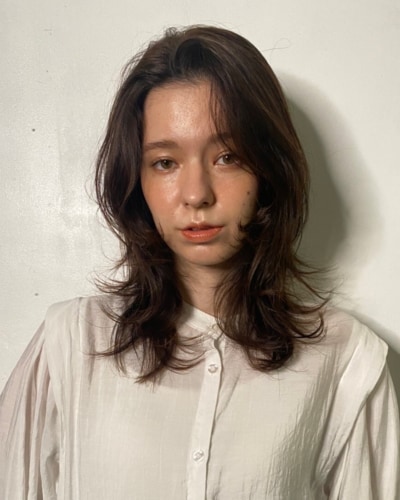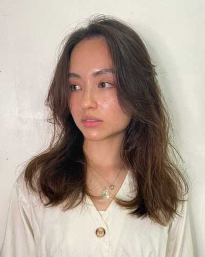 ヘアカラーはアッシュブラウンで毛先にかけてナチュラルなグラデーションにすることでこなれ感を演出。スタイリングでは作りこまない程度にゆるく波巻きすることでクールさを出しています。前髪はセンターで立ち上げることで華やかな印象に。