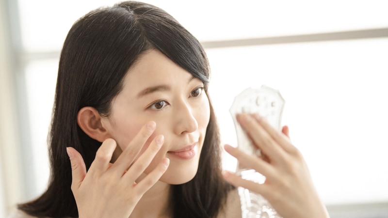 撮影前はお酒や夜更かしも控えているので、今日のお肌の調子もいい感じ。20代のときはメイクを落とさず寝ても肌がツヤツヤだったけど、30代になると日頃のケアが大事になってきますよね〜。