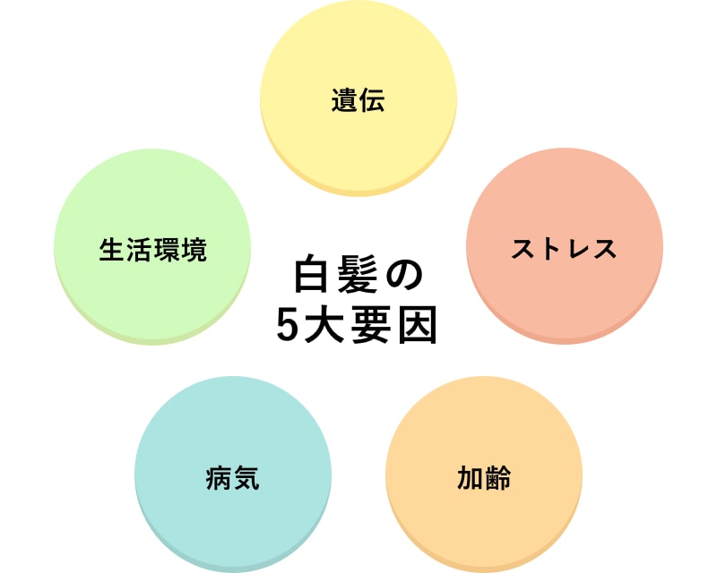 白髪になる原因は「遺伝」「加齢」「生活環境」「病気」「ストレス」の5つ。しかし、特定の要因には絞りきれず、いくつかの要因が重なって白髪になる。