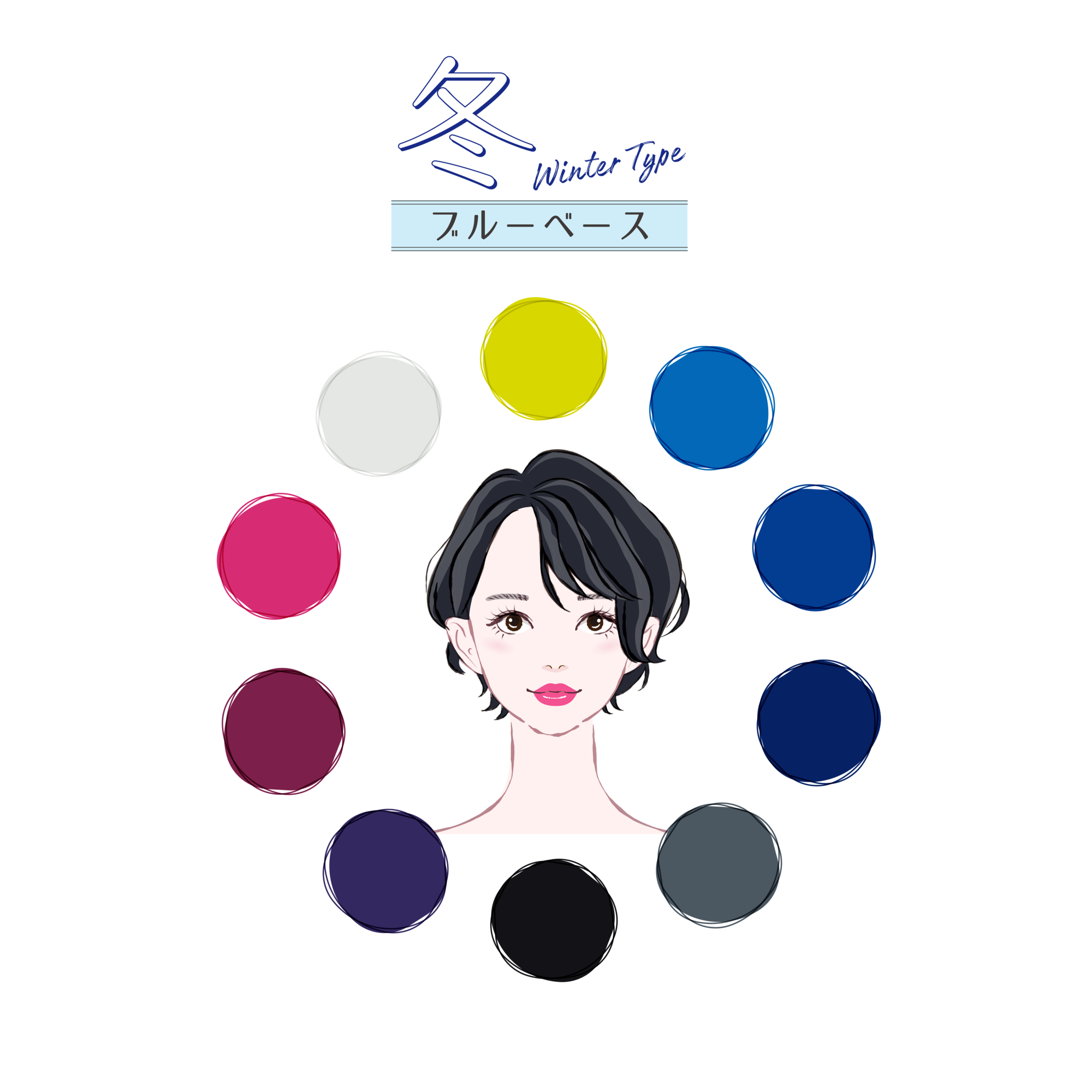 ブルベ冬タイプは、黒目が真っ黒に近い色で目の印象が強い傾向があります。また、頬は赤みよりピンクがかった色で、全体の印象がクールで大人っぽい方が多い傾向です。