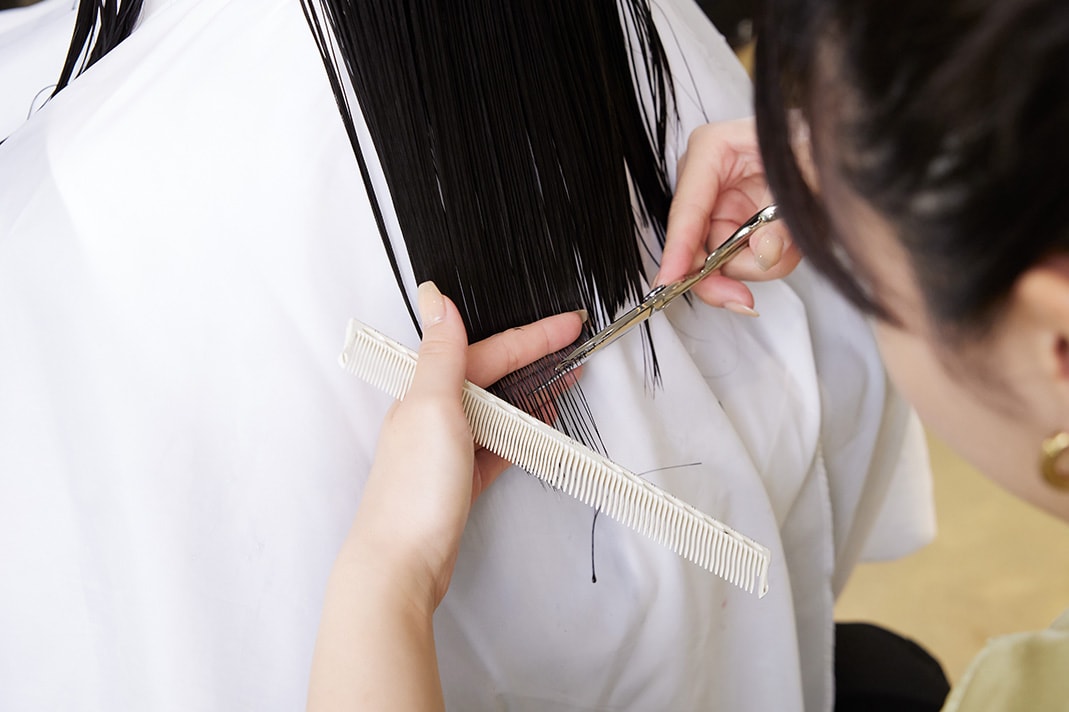 ――毛先は、はさみを真横にいれて一直線のカットに。不揃いになった部分もきれいになって、毛先のぱさつきも解消!