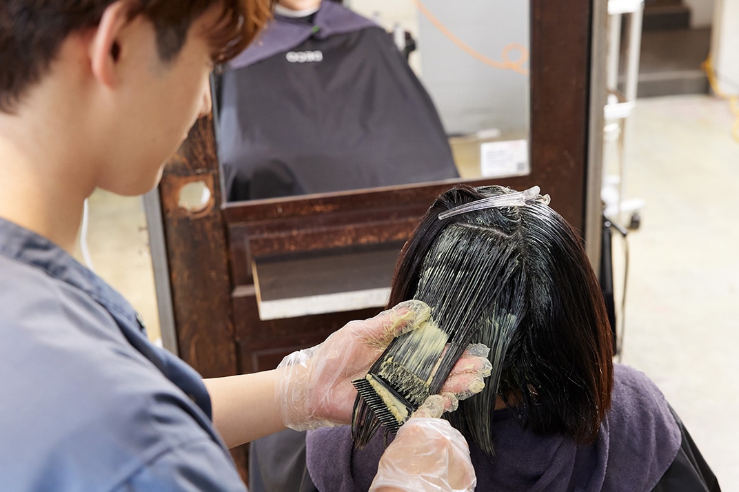 今回はオリーブアッシュで染めていきます。オリーブは赤みを打ち消す効果があるので、褪色してもアッシュが長持ちするんです。暗髪でも透明感とこなれ感がでる人気のカラーですよ。