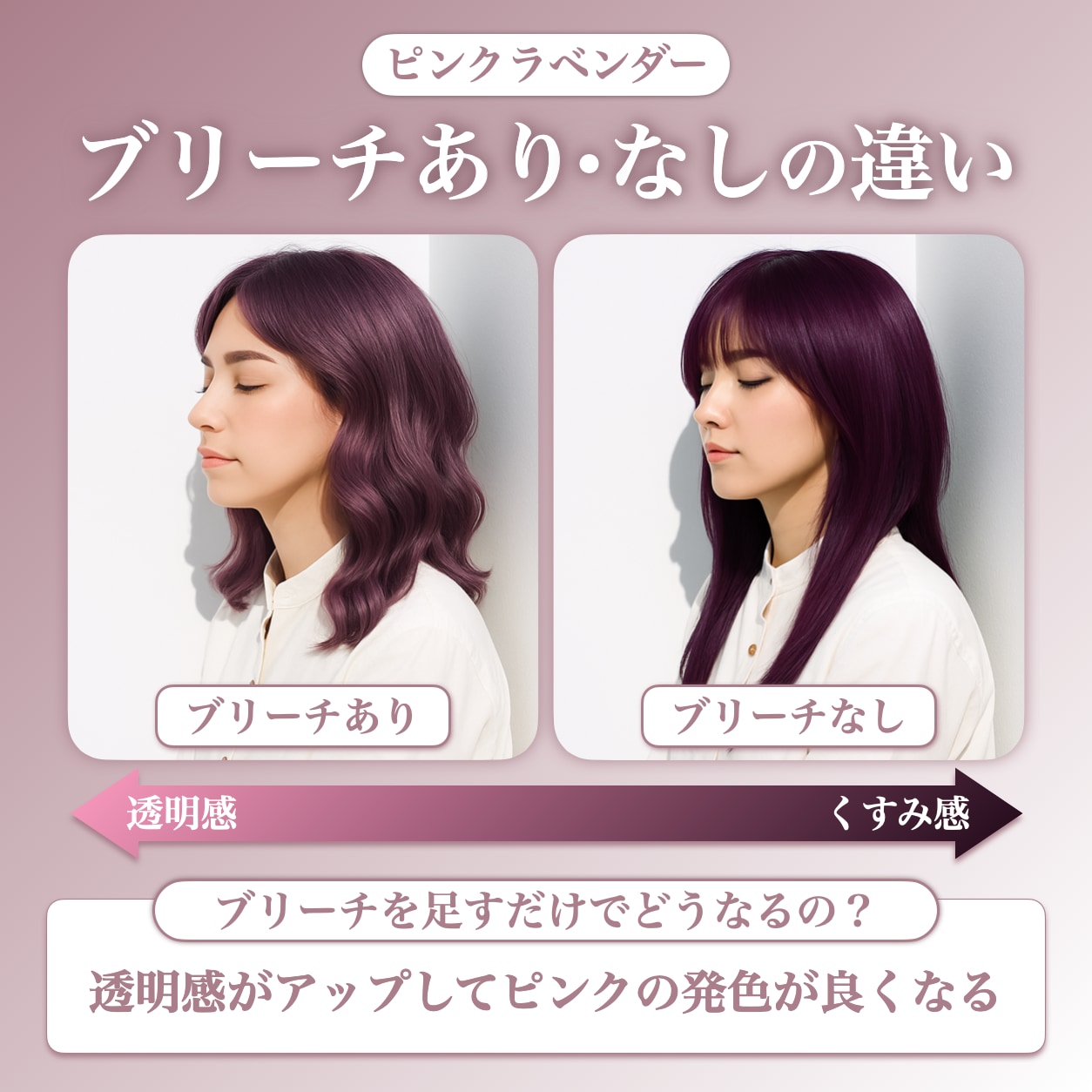 ブリーチを入れておくことで、くすみ感のあるラベンダーがふんわり透けて見え、ピンクの発色もぐっと上品に仕上がります。