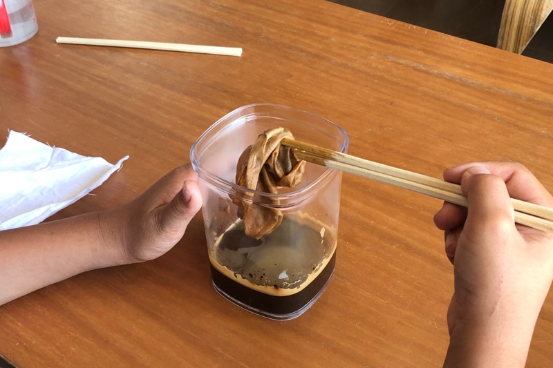 (1) インスタントコーヒーとココアをそれぞれ10gずつ器に入れて、60℃のお湯を100ml注ぎ、割り箸でよくかき混ぜる。