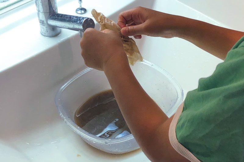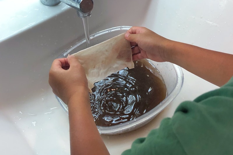 (3) 冷めたのを確認したら、それぞれの器から布を取り出す。まずそのまま絞り、水洗いした後に洗剤を使って手でもみ洗いをする。