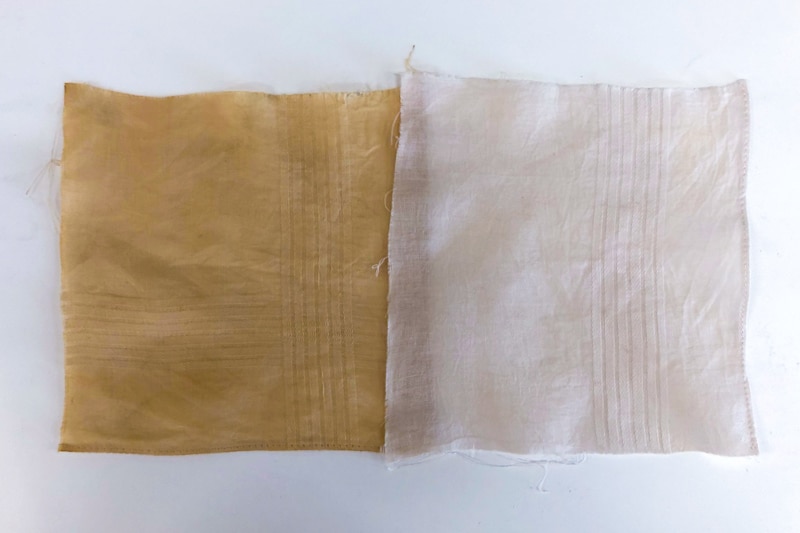 コーヒーを使って染めたものは黄金色に染まるのに対し、ココアを使って染めたものは、あまり染まらない結果となりました。