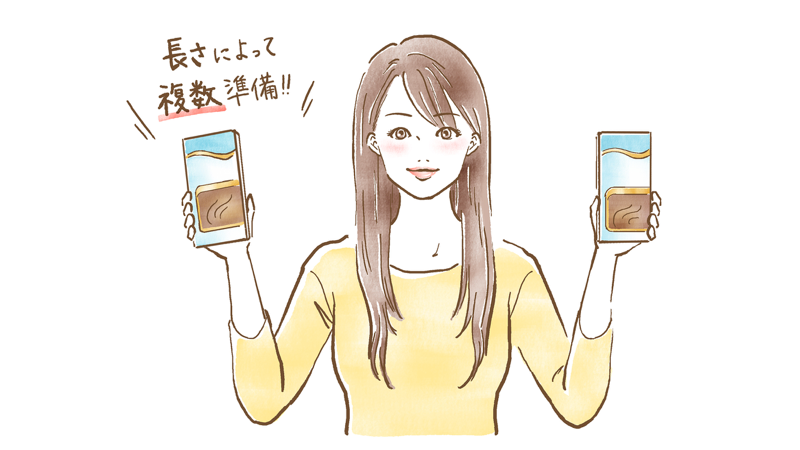 ロングヘアや毛量の多い人は髪全体に使うと1箱では足りなくなることがあるので、事前に2箱用意して。また、使う商品によっても使用量の目安が違うため、詳しくは各商品の使用説明書をご確認ください。