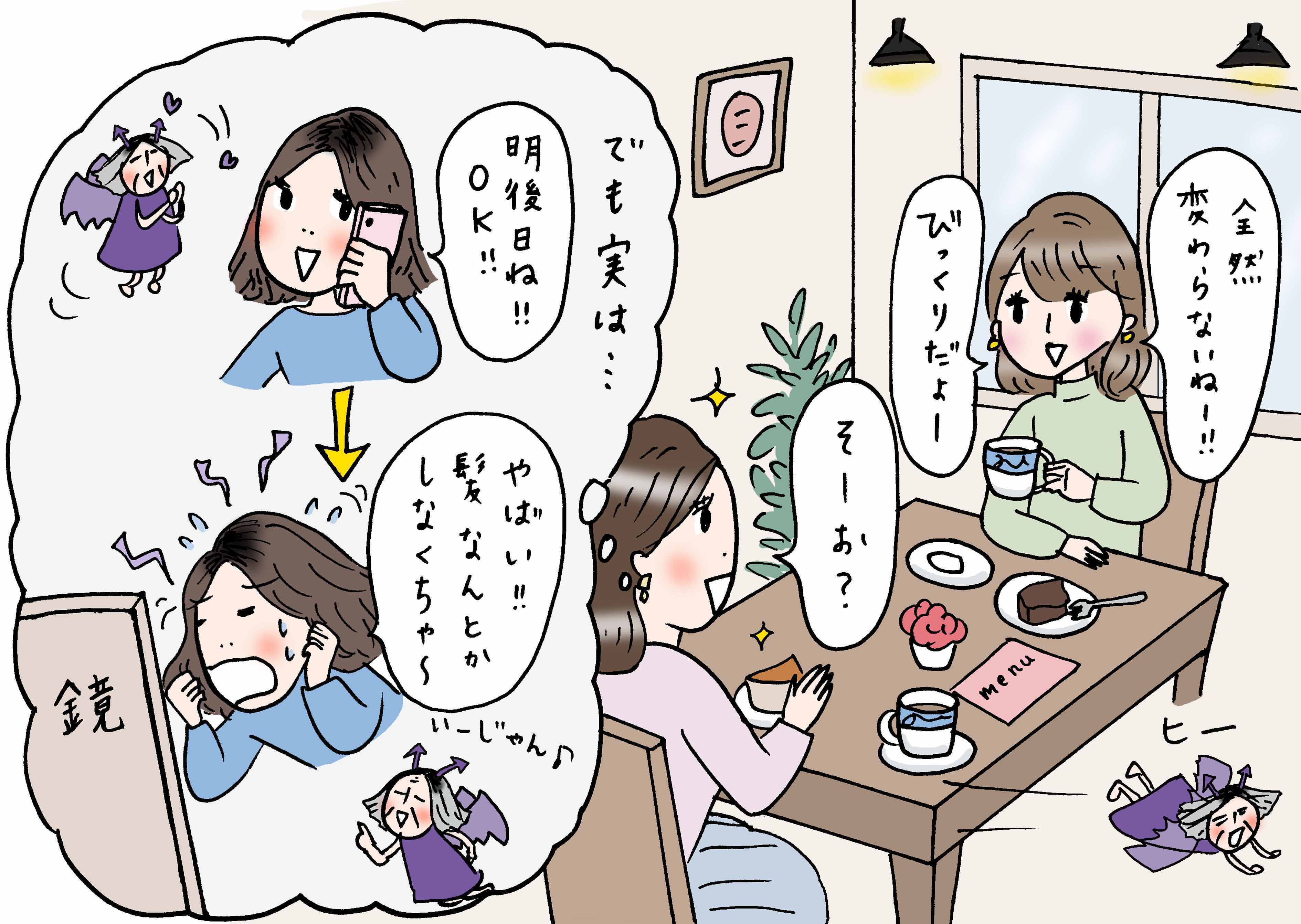 こまめに染めていても、髪はどんどん伸びてくるので、すぐに根元がキラキラしてきて鏡を見ると「あーあ」という気持ちに。職場の後輩たちと話しているときも、白髪が気になってしまいます。