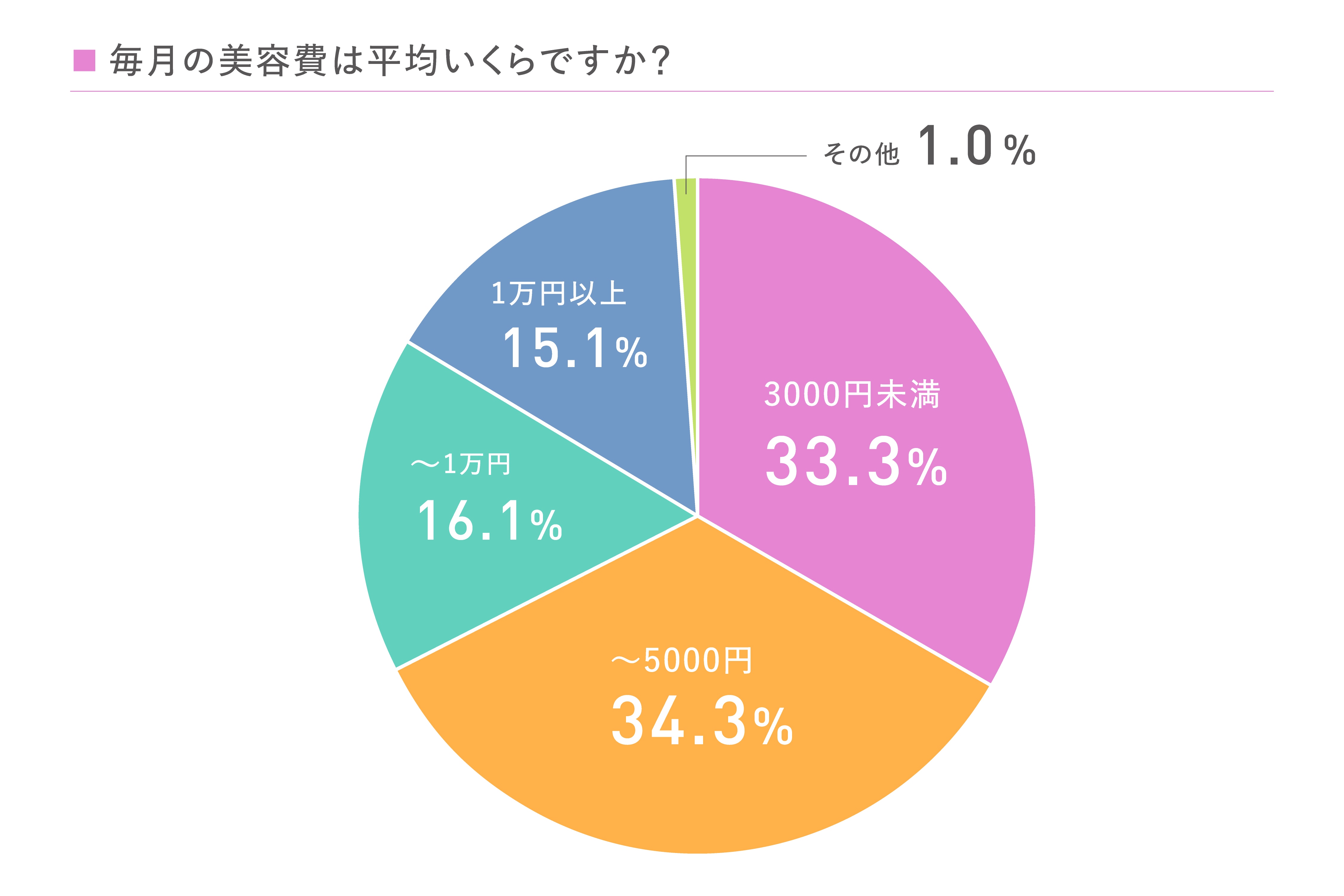 毎月の美容費の平均は5,000円以内が67%を占めています。1万円以上かけられる人は15%。基礎化粧品とファンデーションなど最低限のメイク用品、数カ月に一度の美容室代が主に。