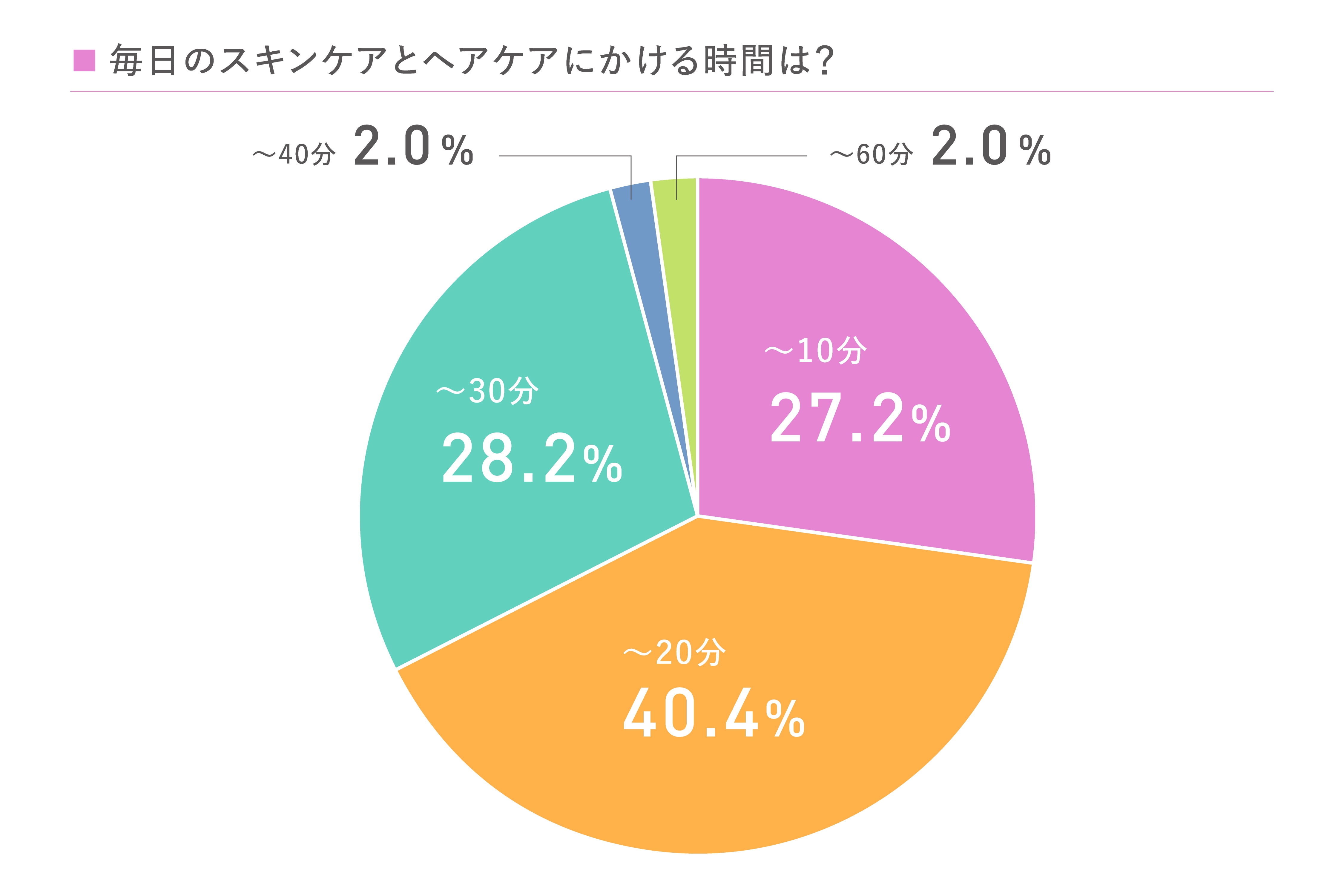 スキンケアとヘアケアにかける時間を調査したところ、1日のうち30分以内が95%という結果に。一番多かったのが、20分で40%。起床後と入浴後にパパっと済ませる傾向にあるようです。