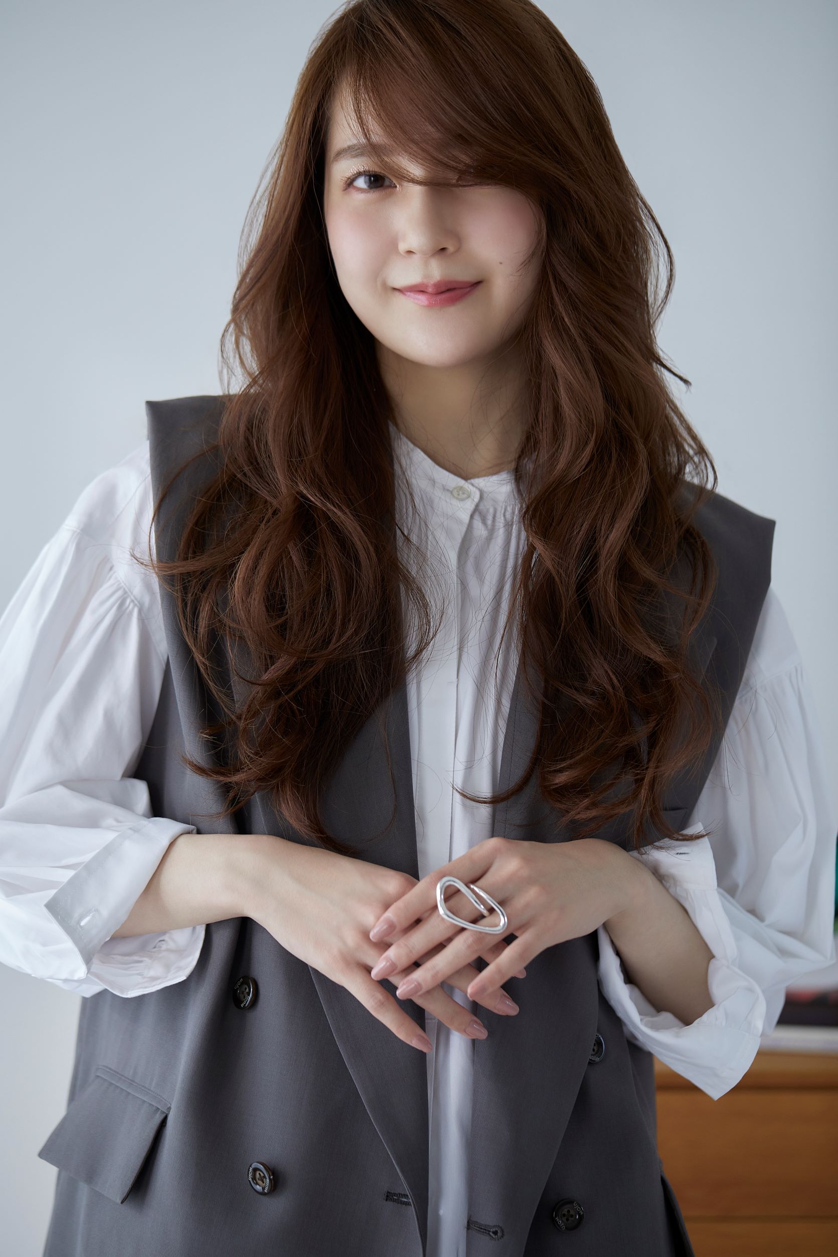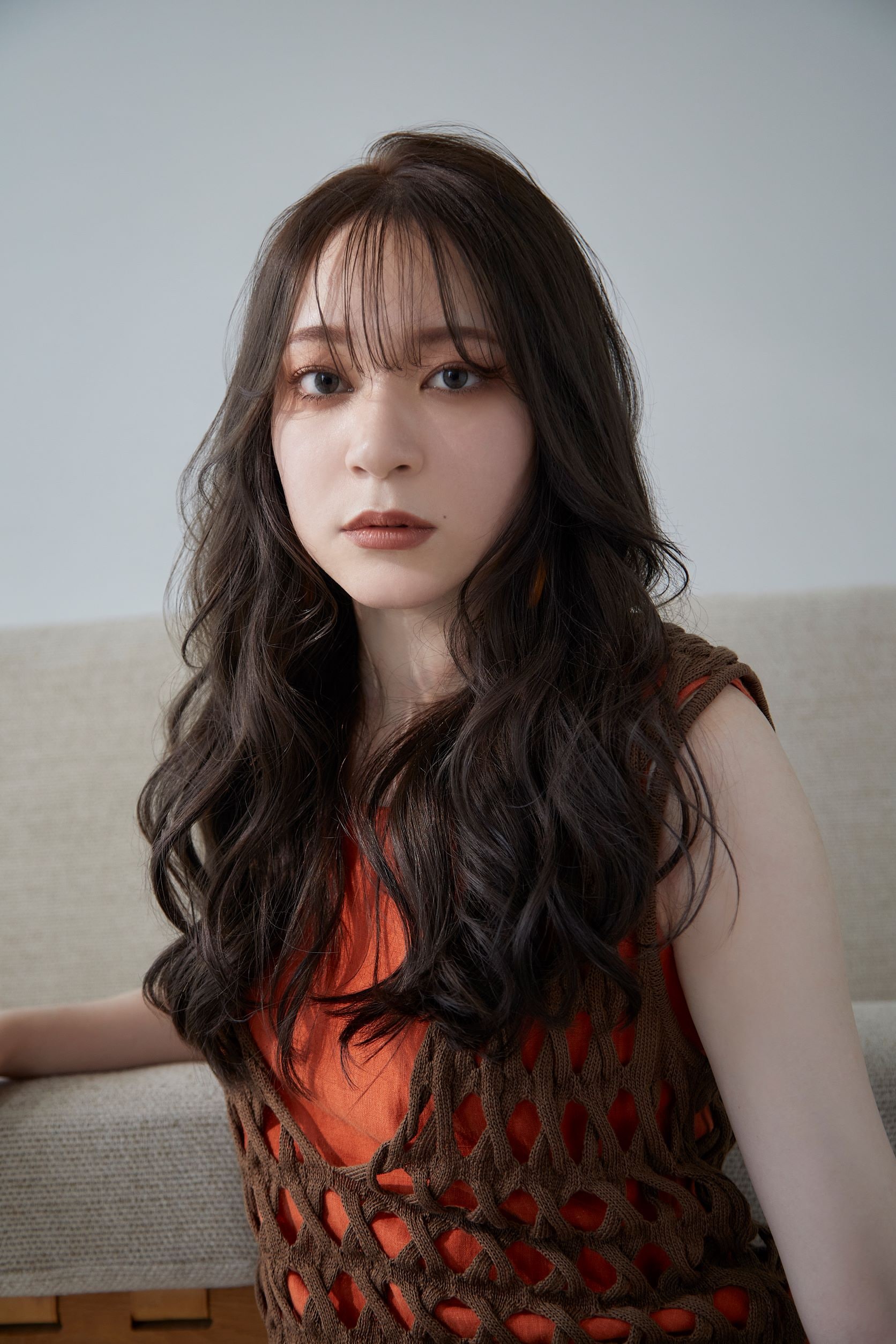 胸元まで届くロングをローレイヤーでカット。毛先は重さを残してデザインします。顔まわりはチークラインにからつながるレイヤーを入れて姫カット風に。巻き髪は32mmアイロンを使ってワンカールを繰り返したら、内側から手グシを通してふんわり感を。手のひらにオイルを適量のばしたら、髪の内側から全体になじませて。
