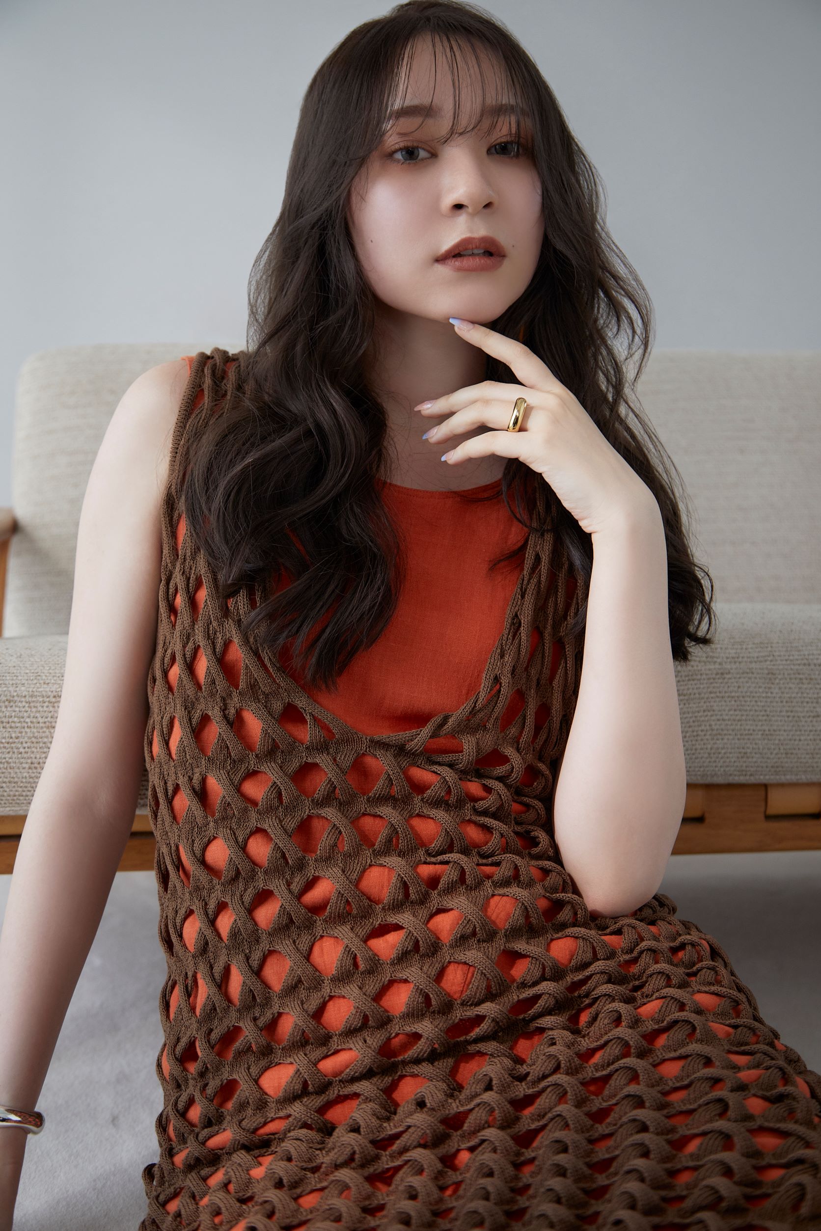 全体のゆるっとした髪質に合わせ、抜け感のあるメイクをチョイス。ポイントは作り込みすぎないアイブロウ。カラーは秋冬のトレンドカラーとして注目されているオレンジレッドに合わせ、テラコッタ系で統一。ポイントにツヤを取り入れて旬顔に