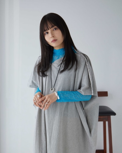 鎖骨下のワンレングスにカットしてから、全体をローレイヤーに。その後、表面に細かいレイヤーを入れて、フロントは高い部分から切り込んで躍動感を。切りっぱなし感のある毛先を強調させるため、巻き髪は毛先逃がしのゆる巻きで仕上げて。巻き髪を終えたら毛束を持ち上げ、全体にスプレーをかけてふんわり髪に。毛先には軽めのワックスで毛先に艶感を