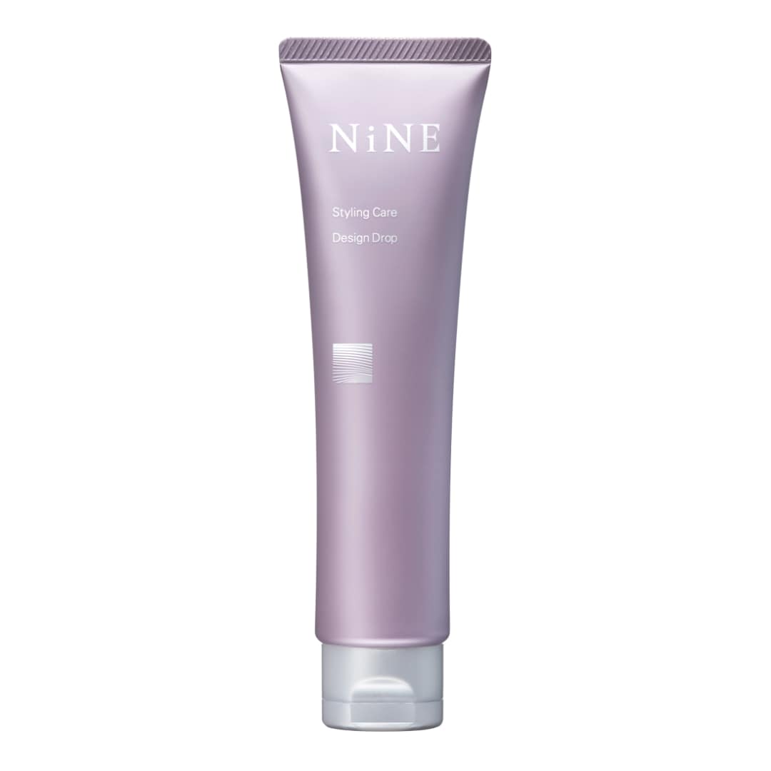 前髪は毛先を巻きすぎないように真っ直ぐ下ろします。クリームベースの「NiNE デザインドロップ」を手のひらによくのばしてから、髪全体に軽く揉み込みます。