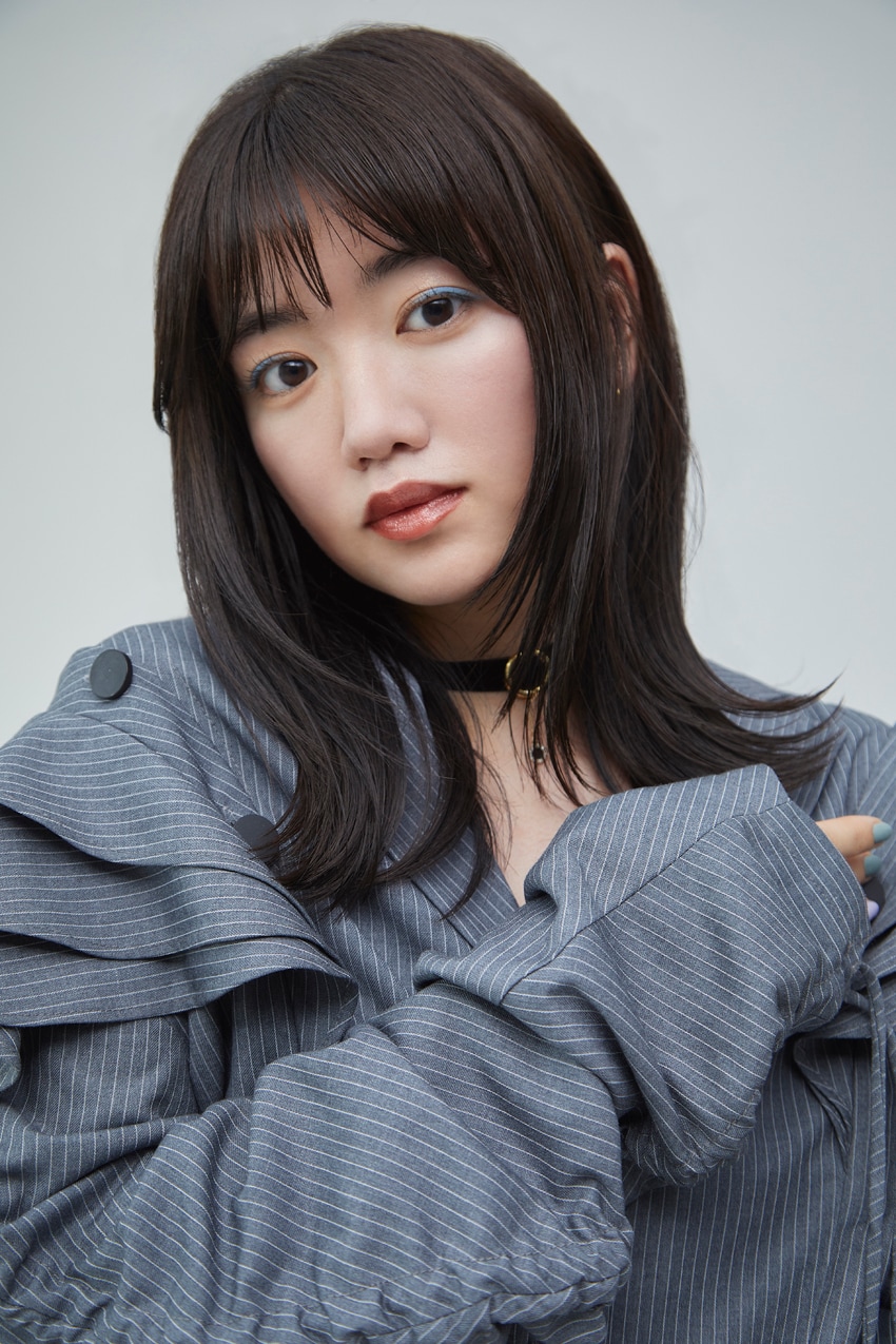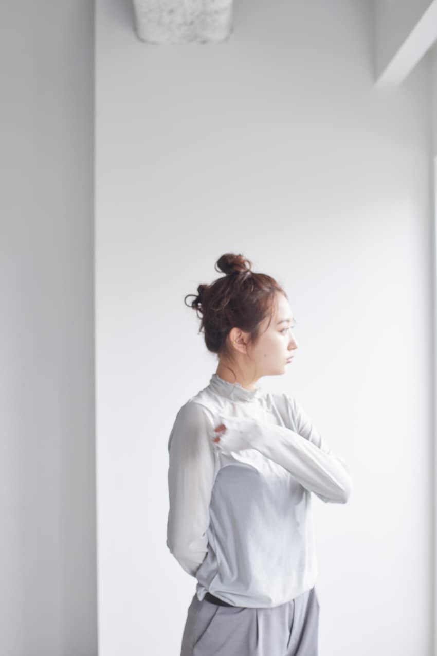 顔まわりのレイヤーを引き立てるため、全体はタイトなシルエットに。
