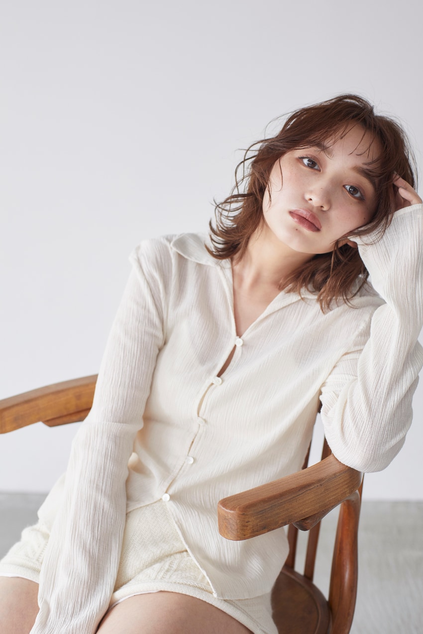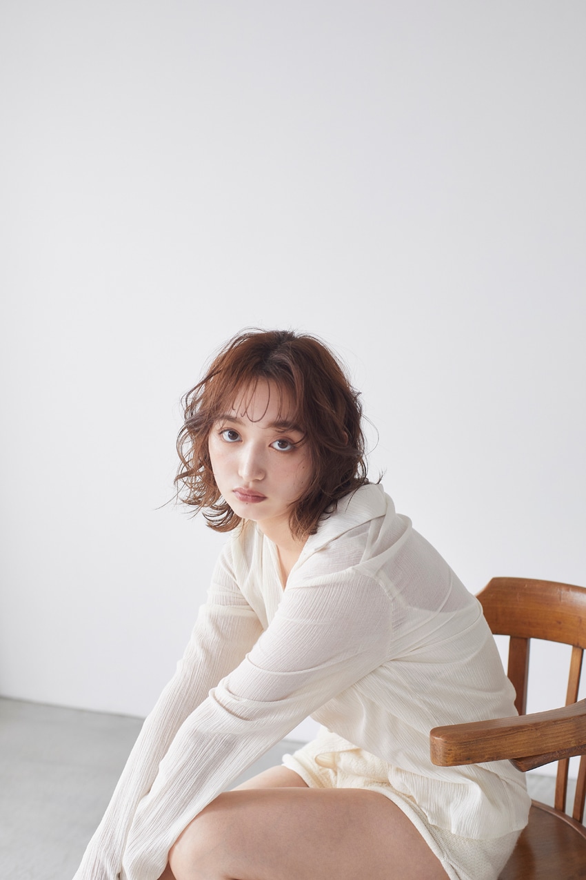 イメージしたのは、クセのような質感のふんわり軽やかなスタイル。パーマをかけずに、アイロン1本で仕上がります。ハーフウェットなスタイリングは湿気の多くなるこれからの季節に最適。シースルーですっきりとした印象の前髪が爽やかな雰囲気をグンとアップしますよ。