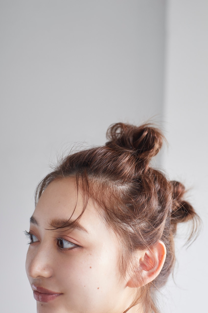 耳上で髪を上下に分けてそれぞれゴムおだんごに。輪っかになった毛束の外側を指で広げて、ゴムを隠しながらねじ込みます。毛先の広がりは上下で左右対称にするのがコツ。前髪はこめかみラインに毛束を残し、「NiNE マルチスタイリングオイル リッチ」をつけます。ゴムだけでできるピンを一切使わないお手軽アレンジです。