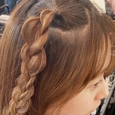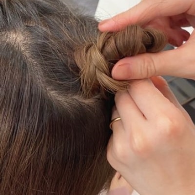 4.ハーフツインの毛束を三つ編みにしてヘアゴムで結んだあと、三つ編みをゆるめます