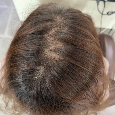 2.少し時間をおいたら巻いたベースの髪にヘアオイルをつけてほぐし、トップ部分の髪をジグザグに分けます