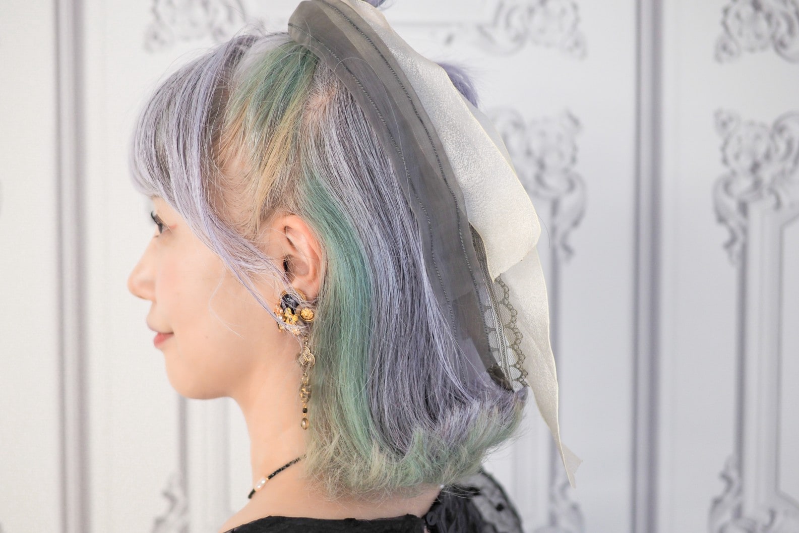 後ろの黒髪が残っている部分はブリーチしていて、このあいだ美容室で緑のカラーを入れてもらったので、今は紫と金髪と緑のグラデーションになっています。