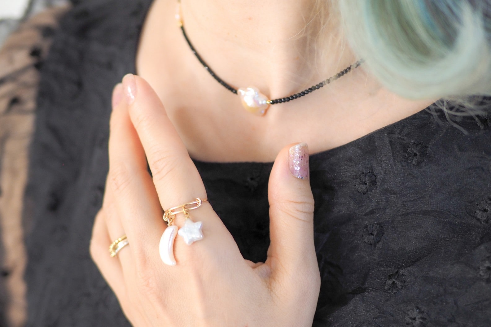 星や月の形をした希少な天然パールを使っていてすごく可愛いんです。チョーカーは花の形をしています。