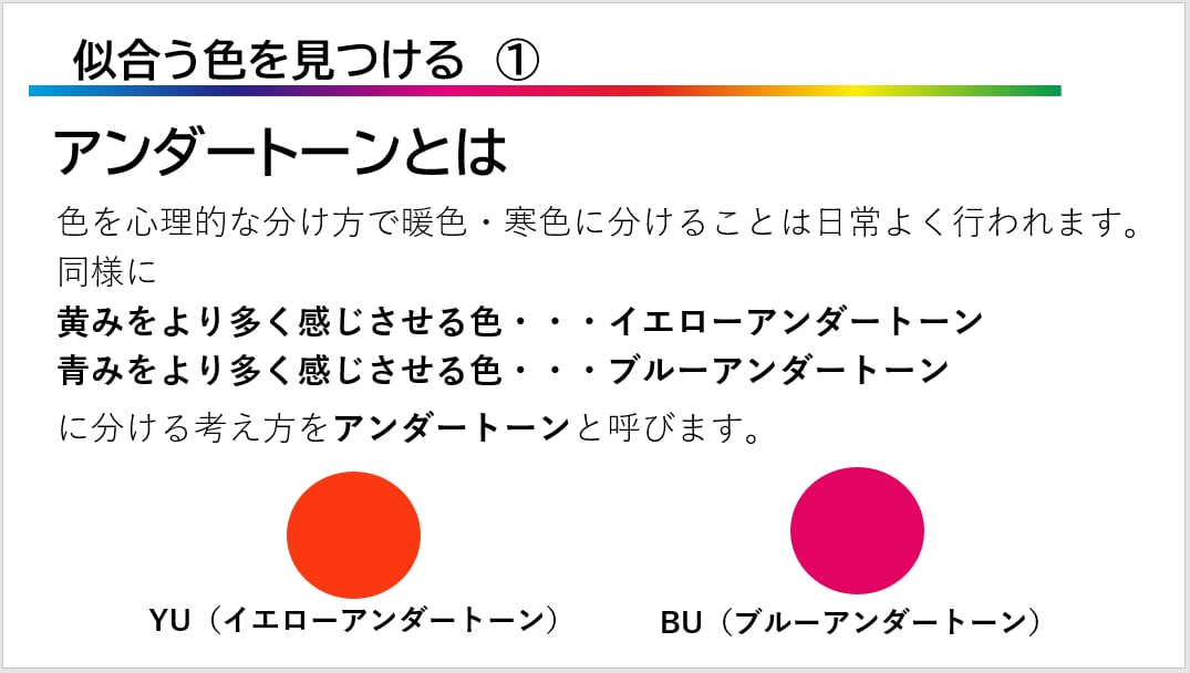 まず初めに「パーソナルカラー」を学ぶところからスタート。パーソナルカラーが何のためにあるのか?知ることで何が変わるのか?を知り、「自分に似合う色」を見つけるために必要なアンダートーン(※)の考え方についても学びました。