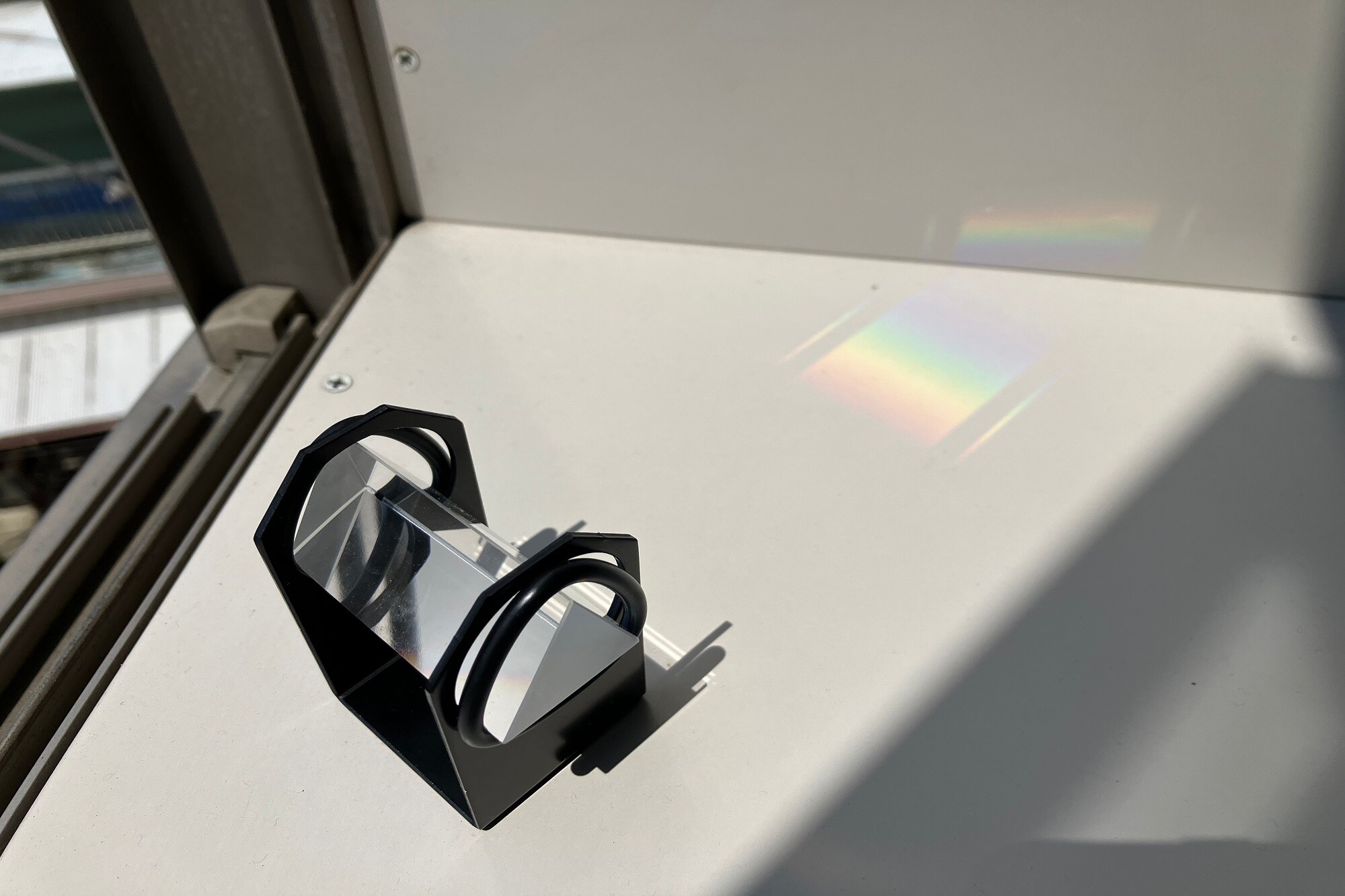 太陽の光にはいろいろな色が含まれています。規則に従って太陽の光を並べてくれるプリズムを使うことで虹色が見えました!