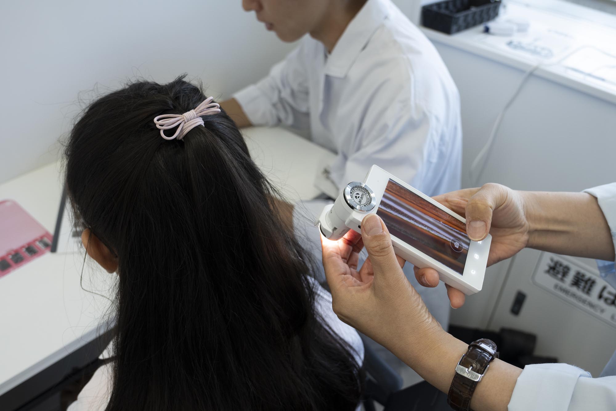 高性能カメラで研究員が髪の毛のキューティクルの状態を見ていきます。