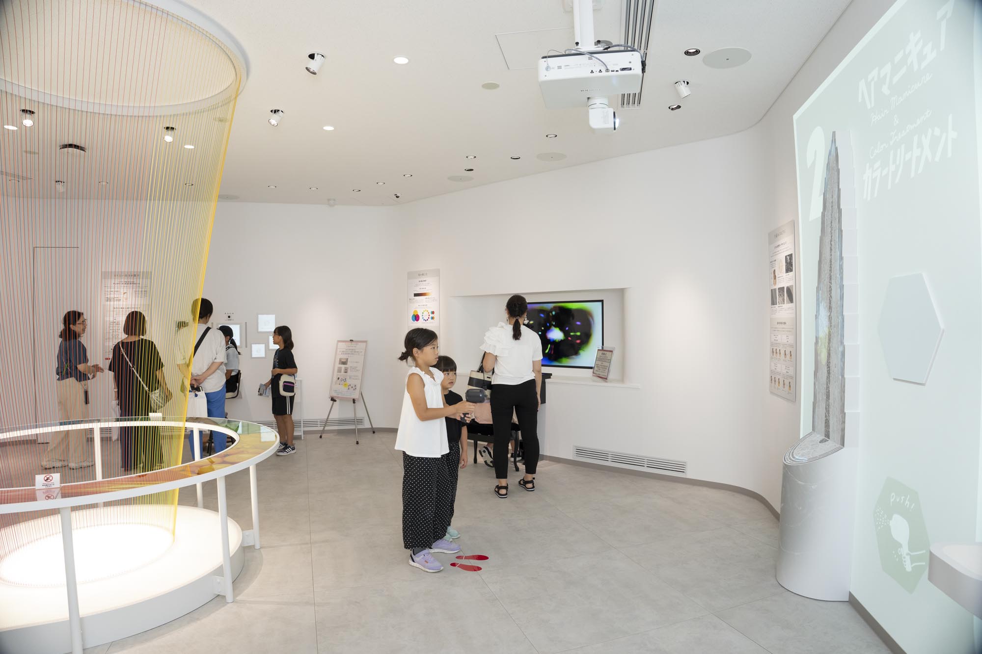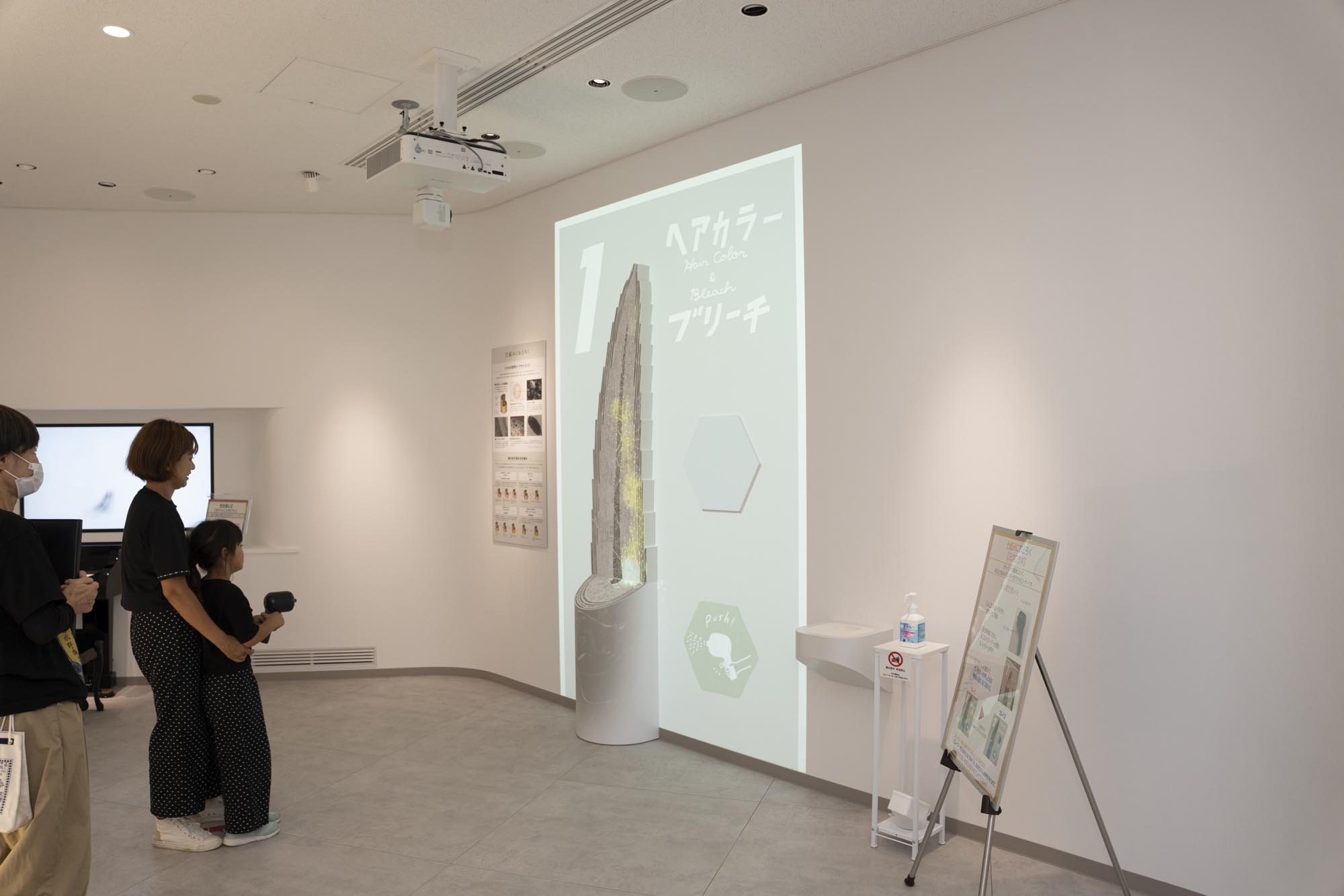 毛髪の断面に、薬剤によって起こる反応をプロジェクションすることで、髪が染まる仕組みを知ることができる体験展示や、