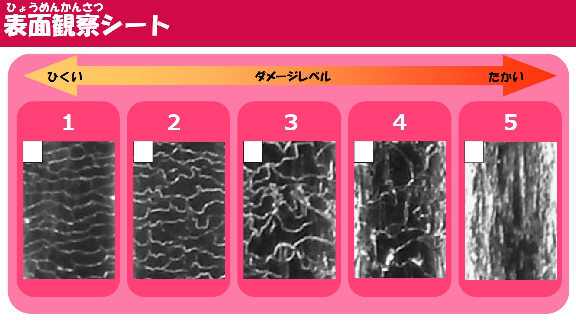 ホーユーでは、毛髪表面の損傷状態について5段階の評価基準を設けています。