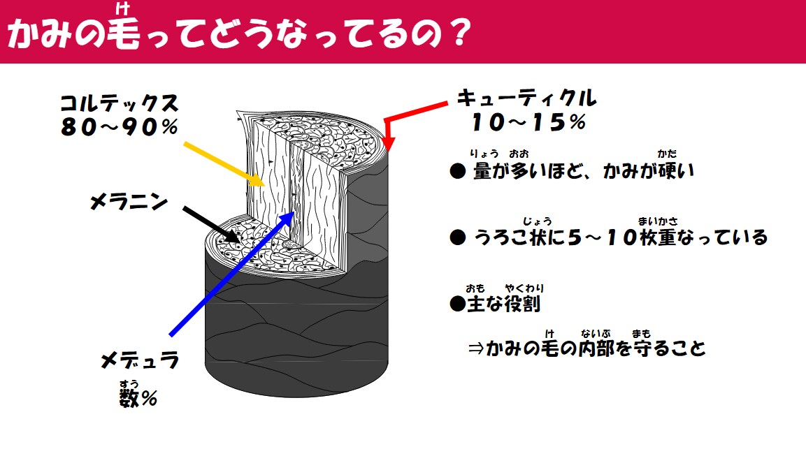髪の毛は一番外側がうろこのようなキューティクルというものに覆われています。その中に、コルテックス、さらに中央にメデュラというものがあります。