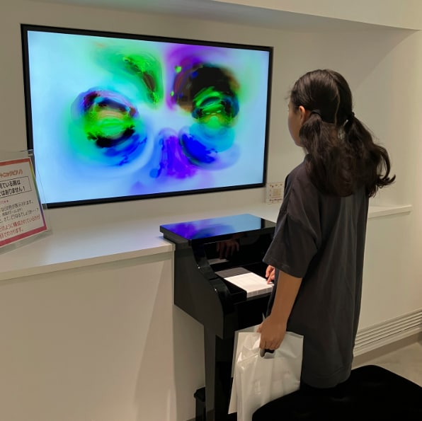 鍵盤をたたくと色々な色が混ざり合って黒が色々な色から出来ていることが体感できる不思議なピアノです。