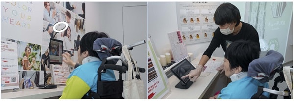 今まで髪を一度も染めたことがないというカミジョウさん。髪色シミュレーションでは、髪色を変えた自分の姿に興味津々。「オレンジ系が素敵ですね!青系も似合いますね!」と、いろいろな髪色をお試しいただきました。