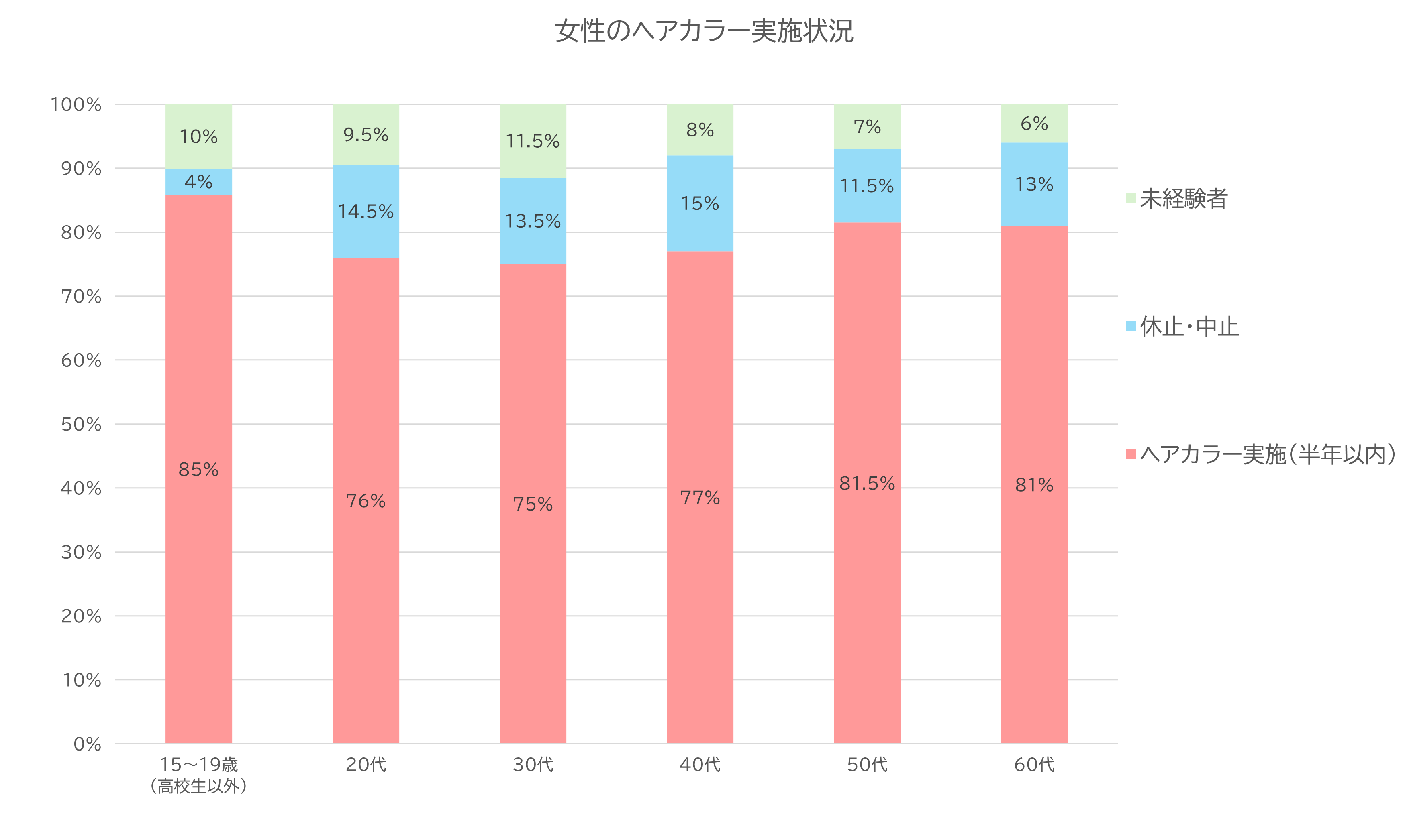 特に15~19歳(高校生以外)の女性では85%と高い割合を示し、高校卒業後の10代のうちに初めてのヘアカラーを実施することが多いと推測されます。
