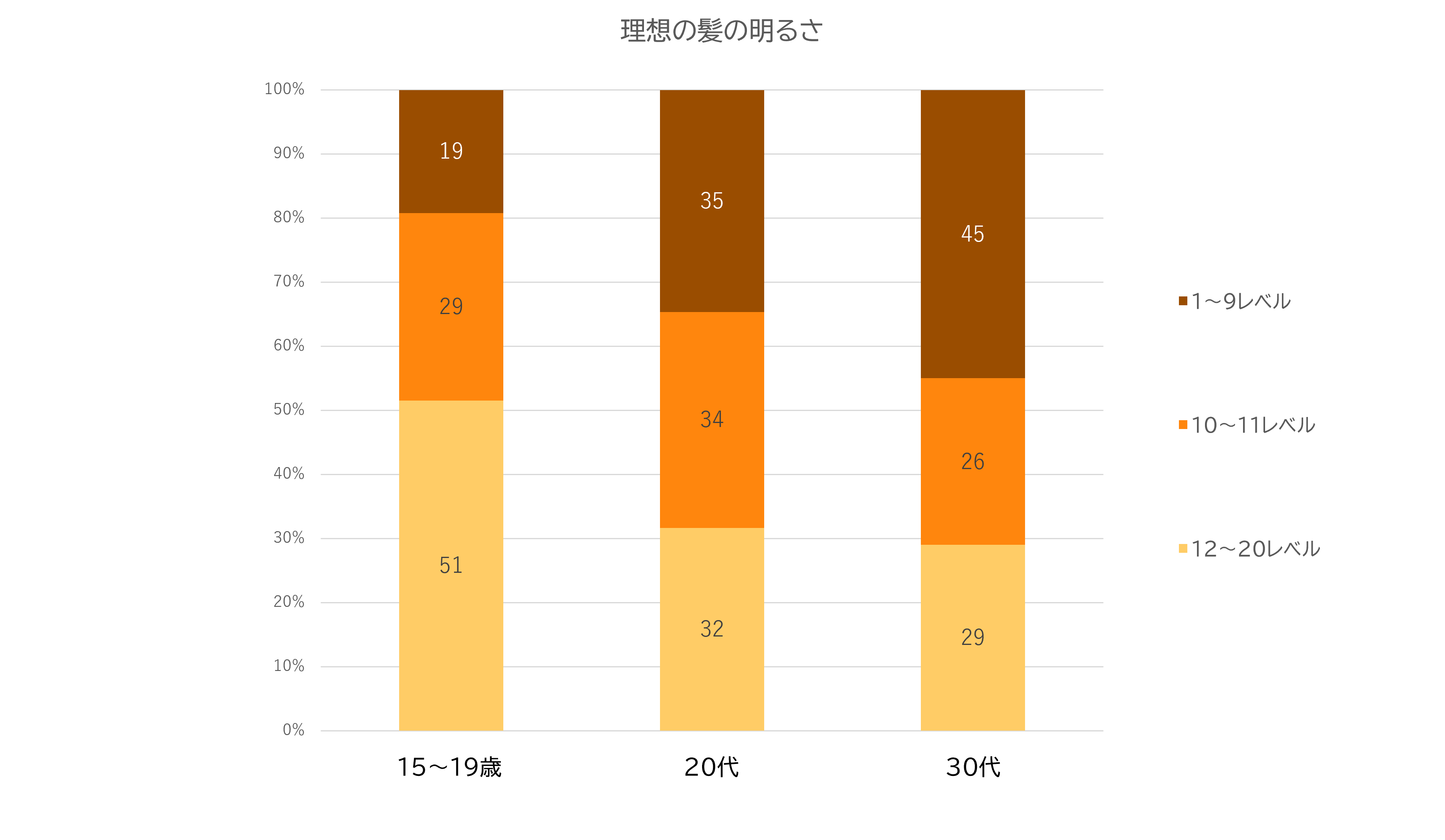 そして、理想の髪色の明るさの調査では、12~20レベルの明るめの髪色を選ぶ人が15~19歳で51%、20代で32%、30代で29%という結果に。