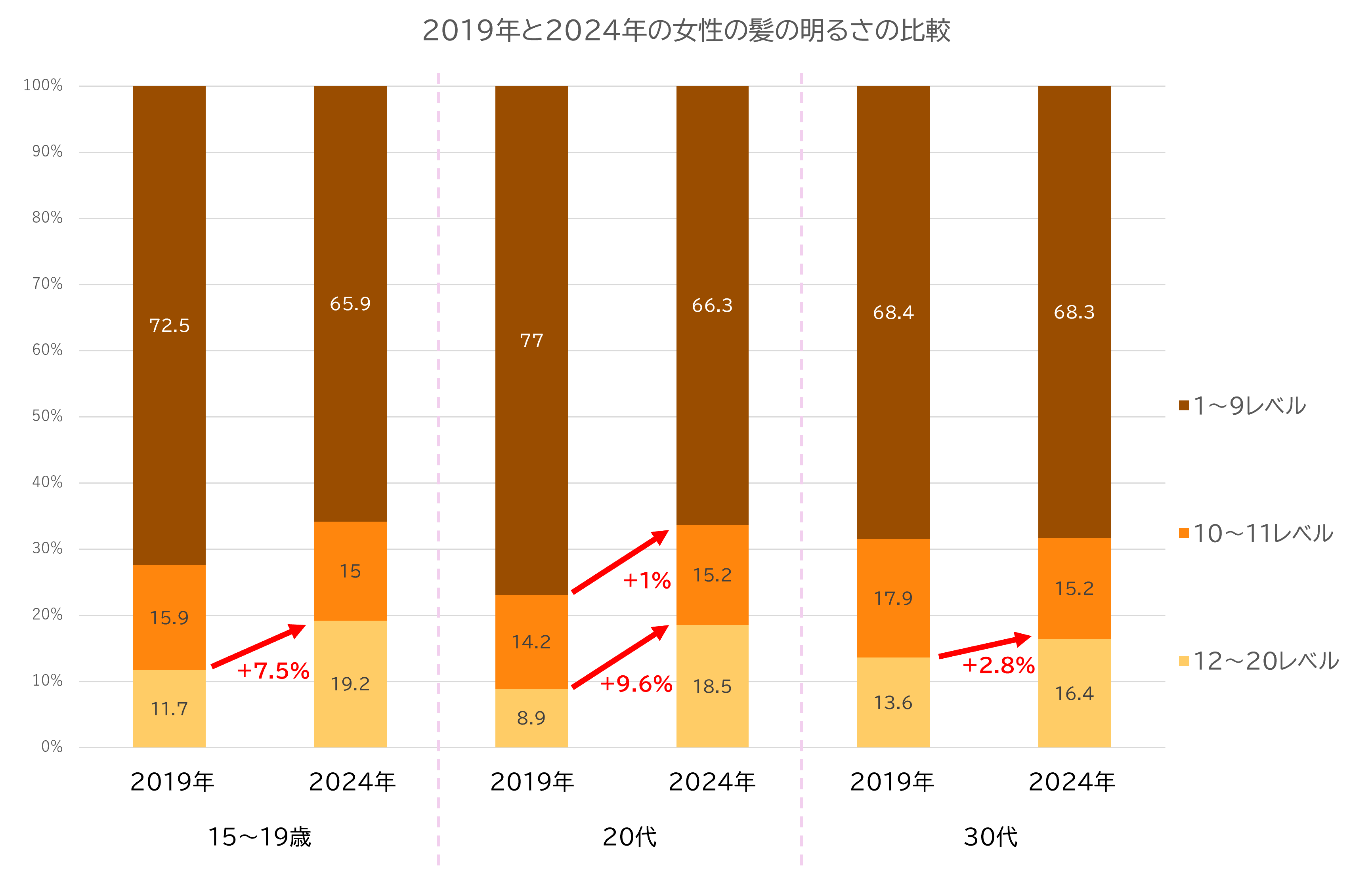 2010年代後半には、ナチュラルで落ち着いた髪色が主流でしたが、2019年と比較すると2024年には明るい髪色の割合が増加しています。