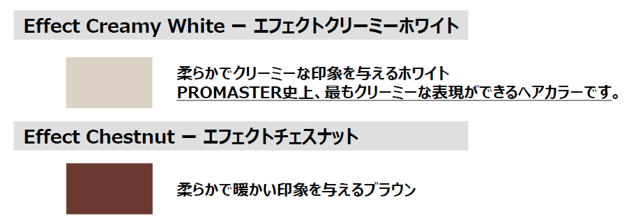 PROMASTER史上、最も高彩度なヘアカラー『Boost Color』から4色調、絶妙なニュアンスを表現し色のバリエーションを増やす『Effect Color』から2色調、合計6色調が発売されます。
