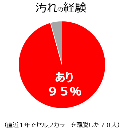 近年、セルフカラーを利用する際の「洗面所や浴室を汚してしまう」「片付けやごみ処理が大変」といったストレスが一因でヘアカラーを中止する人が増加しています。当社が実施した調査においても、ヘアカラーの中止・休止理由として、「汚れる」「片付けが面倒」が上位に挙がっています(図1)。特に賃貸住宅の退去時にかかるクリーニング費用や、新築の家での汚れが大きなストレスになっているという声も少なくありません。実際にセルフカラーをやめた人のうち95%が「自宅を汚した経験がある」と回答しており(図2)、セルフカラーの継続を阻む大きな障壁となっています。
