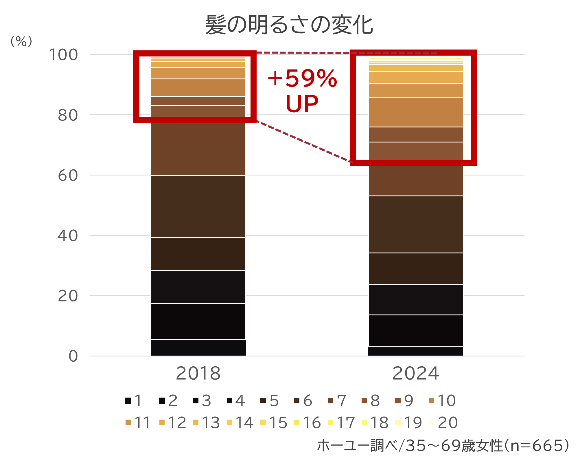 近年の白髪染め市場では、髪色を明るくすることで白髪を自然にぼかすスタイルが広まり、明るめの髪色を選ぶ女性が増加しています。実際に8レベル以上の明るめの髪色を選ぶ女性は、7年前と比較して1.6倍に伸長しており、従来のブラウン系カラーだけでなく、アッシュやピンク、グレージュなどのニュアンスカラーを選ぶ方が多い傾向にあります。※ホーユー調べ