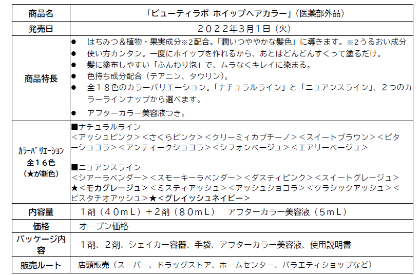 ホーユー株式会社(愛知県名古屋市)は、若い女性に人気の女性黒髪用ヘアカラーリングシリーズ「ビューティラボ ホイップヘアカラー」より新色2色<モカグレージュ><グレイッシュネイビー>を、2022年3月1日(火)より発売いたします。