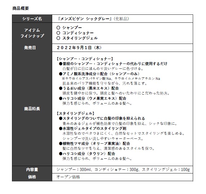 ホーユー株式会社(愛知県名古屋市)は、男性向け白髪ケア市場のリーディングブランドである「メンズビゲン」より、本来の髪色を活かして整え、髪にシックな印象をプラスする白髪ケアシリーズ『メンズビゲン シックグレー』シリーズを、2022年9月1日(木)よりAmazon限定にて発売いたします。