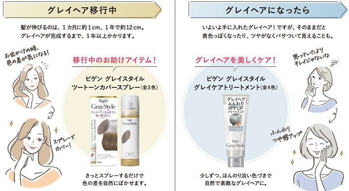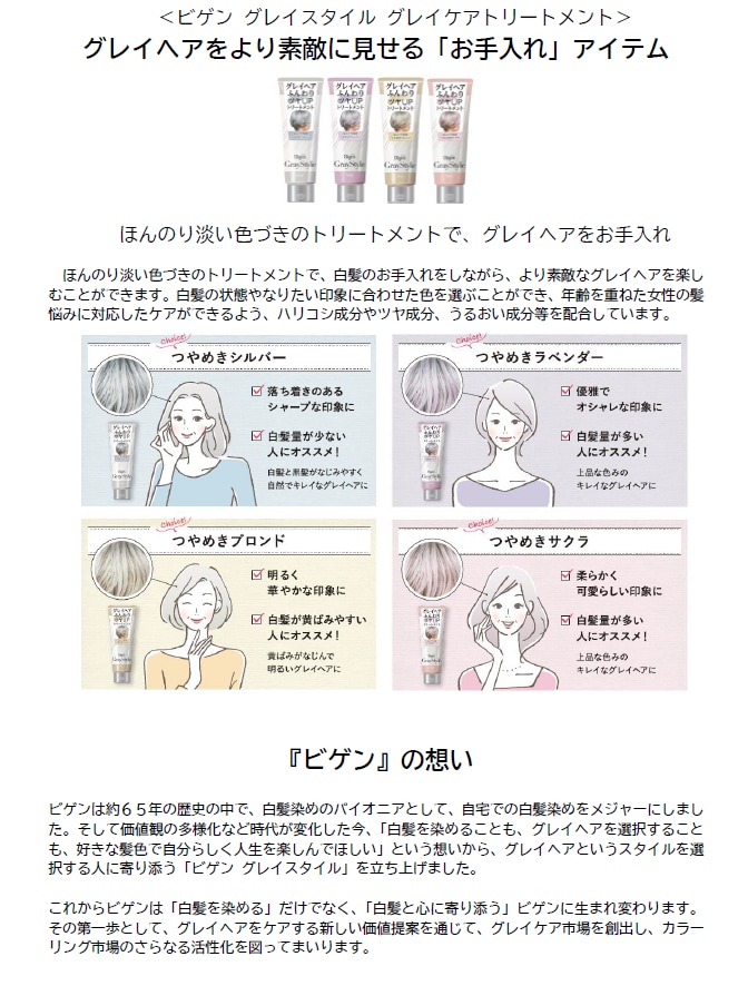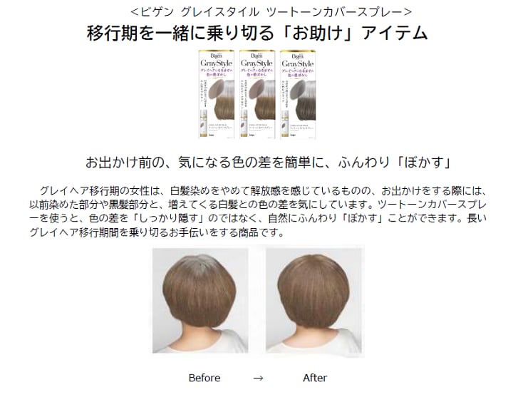 2018年の流行語大賞ノミネート以降、グレイヘアという言葉は多くの方に認知されていますが、グレイヘアの移行期をサポートする商品やグレイヘアをケアする商品は世の中にまだ少ないのが現状です。 人生100年時代、白髪と向き合う時間は長く、向き合い方や価値観が多様性に富んでいる中、グレイヘアを選択する価値観に寄り添っていく、「ビゲン グレイスタイル」を発売いたします。
