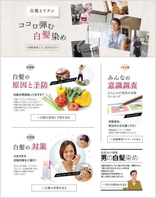 まだ白髪染めをお使いでない方も、すでにお使いの方も、お役立ち情報が満載です。 どうぞお気軽にご覧ください。