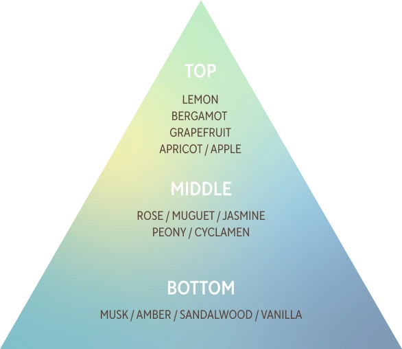 爽やかなレモン、ベルガモット、グレープフルーツをトップに、ローズやピオニー、ミュゲ、ジャスミンが優しく包み込み、さらにアンバーとバニラ、サンダルウッドが加わった、凛とした気品とぬくもりが共存する柔らかな香り。まるで時間という概念から解き放たれるように、心地よく静かに広がる華やかさを演出します。