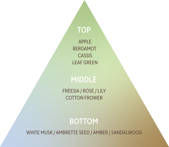 みずみずしいアップルやベルガモット、リーフグリーンをトップに、フリージア、ローズ、リリー、コットンフラワーが重なり、さらにホワイトムスクとアンバー、サンダルウッドが包み込む、清潔感とぬくもりが調和する穏やかな香り。まるで記憶の中の美しい情景がふと蘇るように、心にやさしく残る無垢な透明感を演出します。