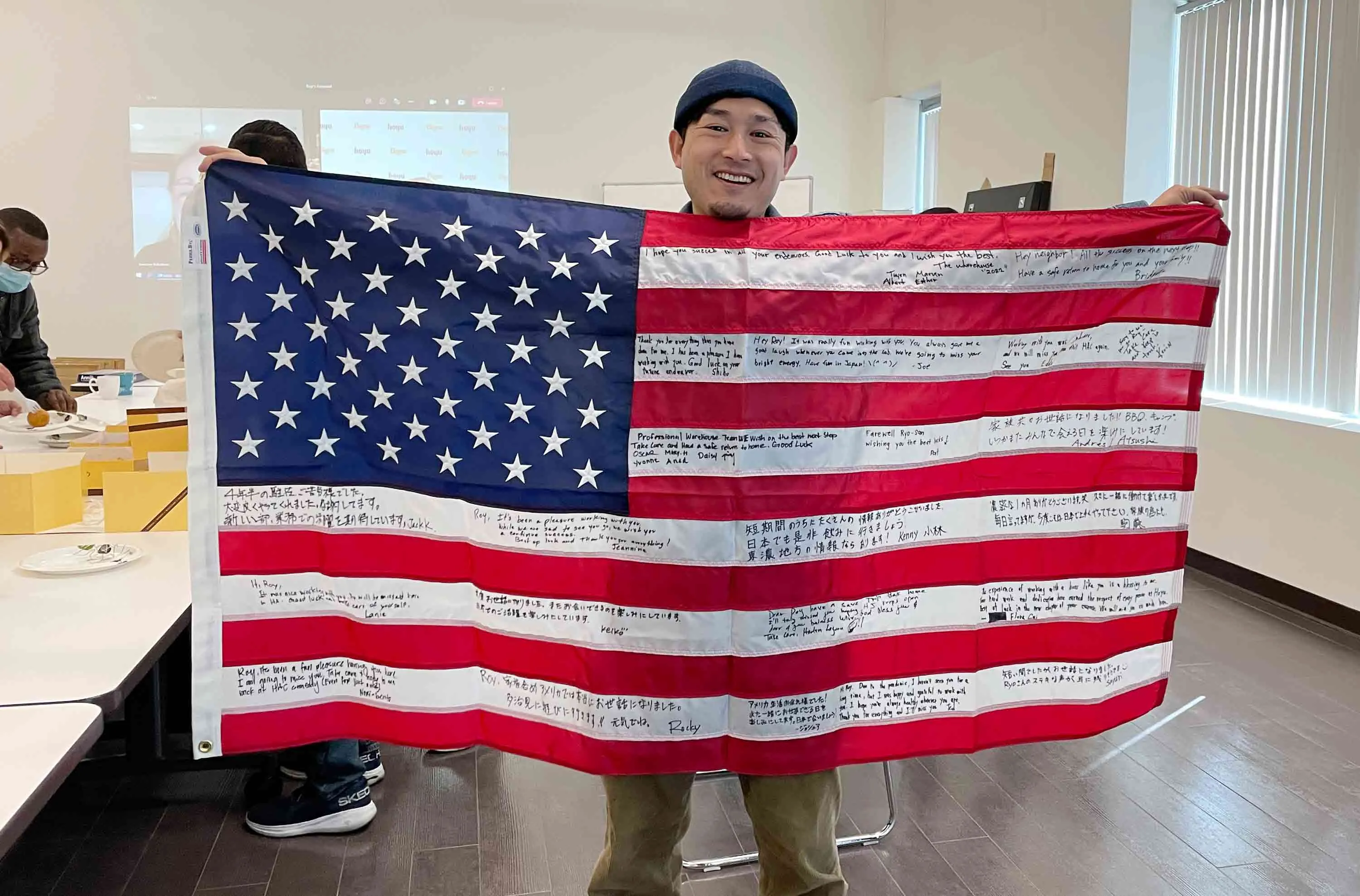 帰任前にHoyu America Co.の社員からもらった寄せ書き入りのアメリカ国旗。温かいコメントが多く寄せられた