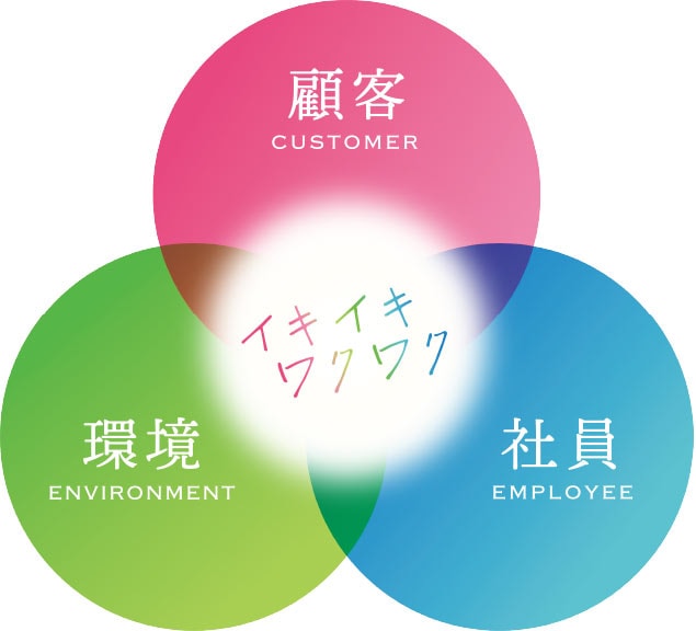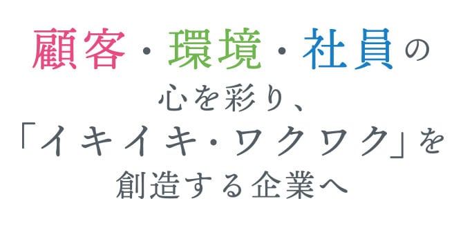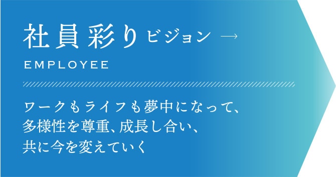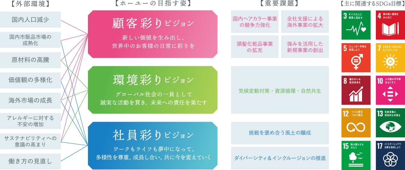 ホーユーのビジョンは、「顧客・環境・社員を彩り、『イキイキ・ワクワク』を創造する企業へ」という全体ステートメントと、「顧客彩りビジョン」「環境彩りビジョン」「社員彩りビジョン」の計4つのステートメントで構成されています。